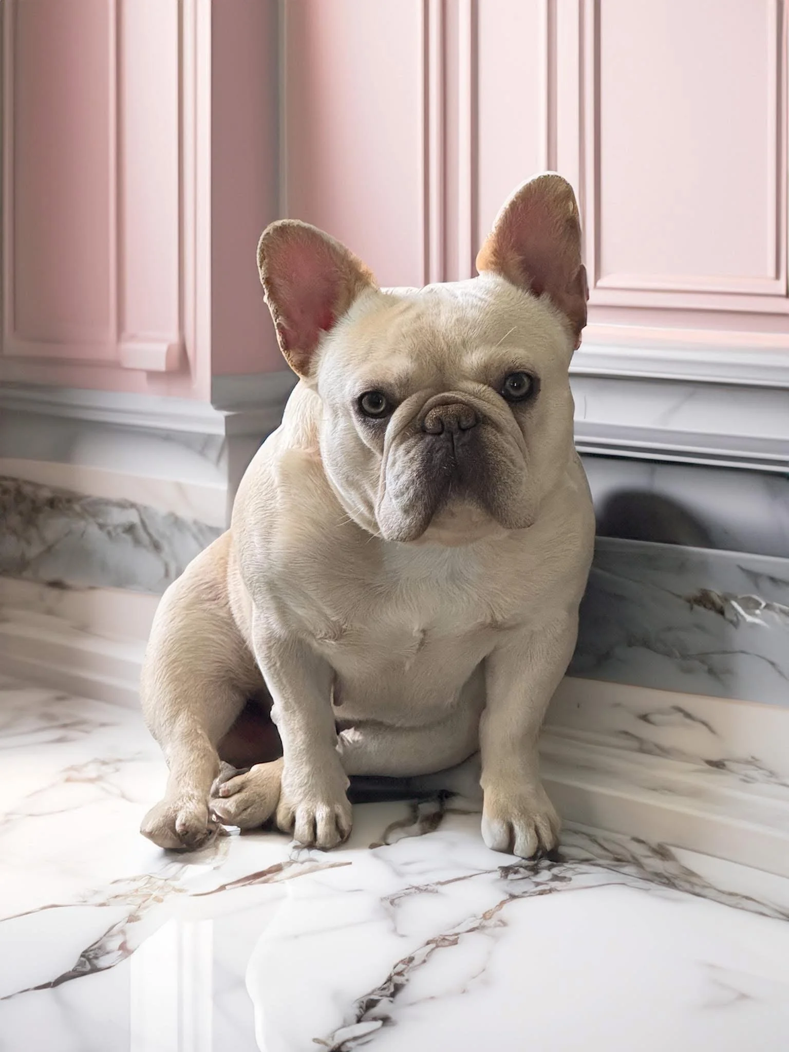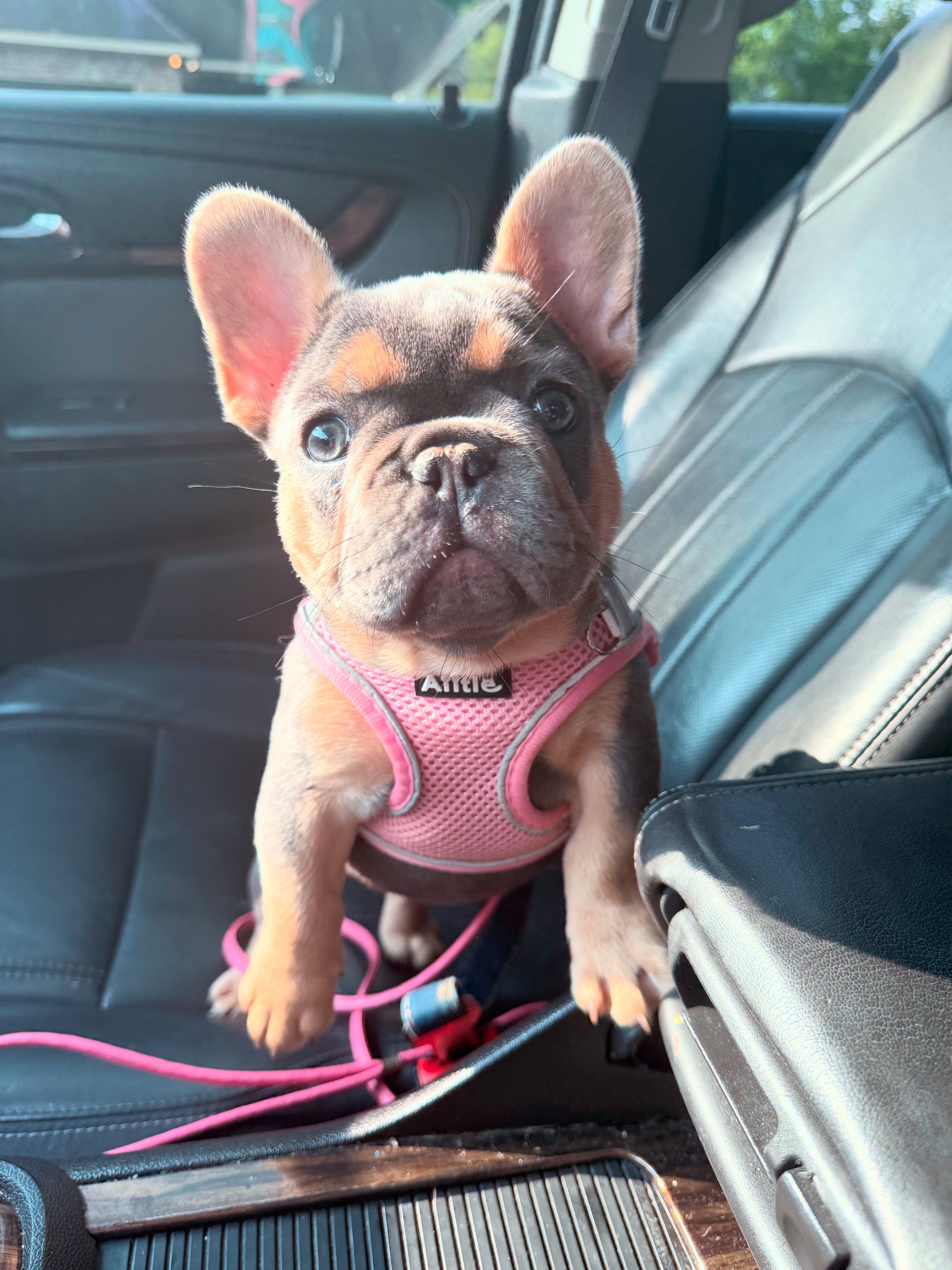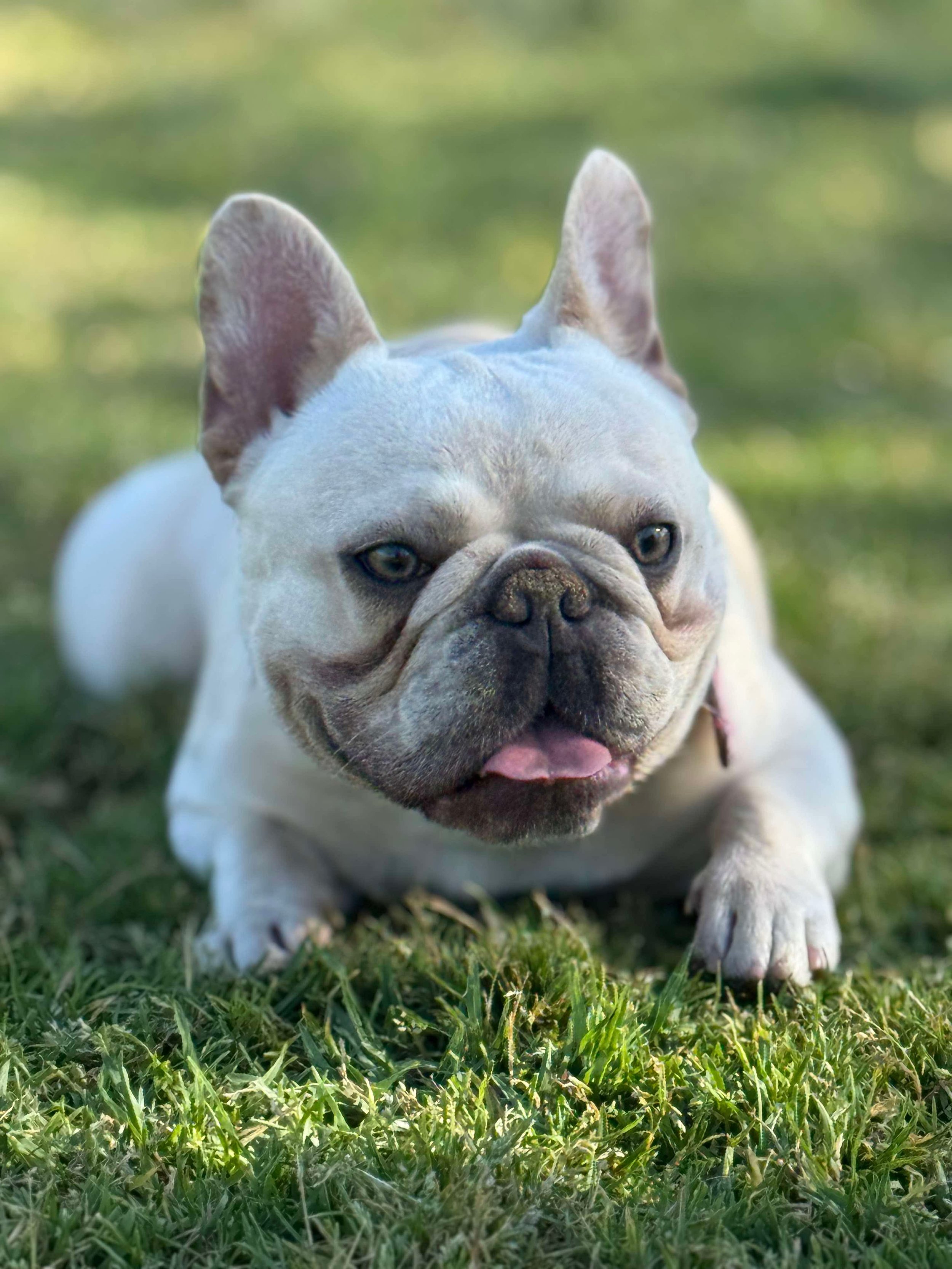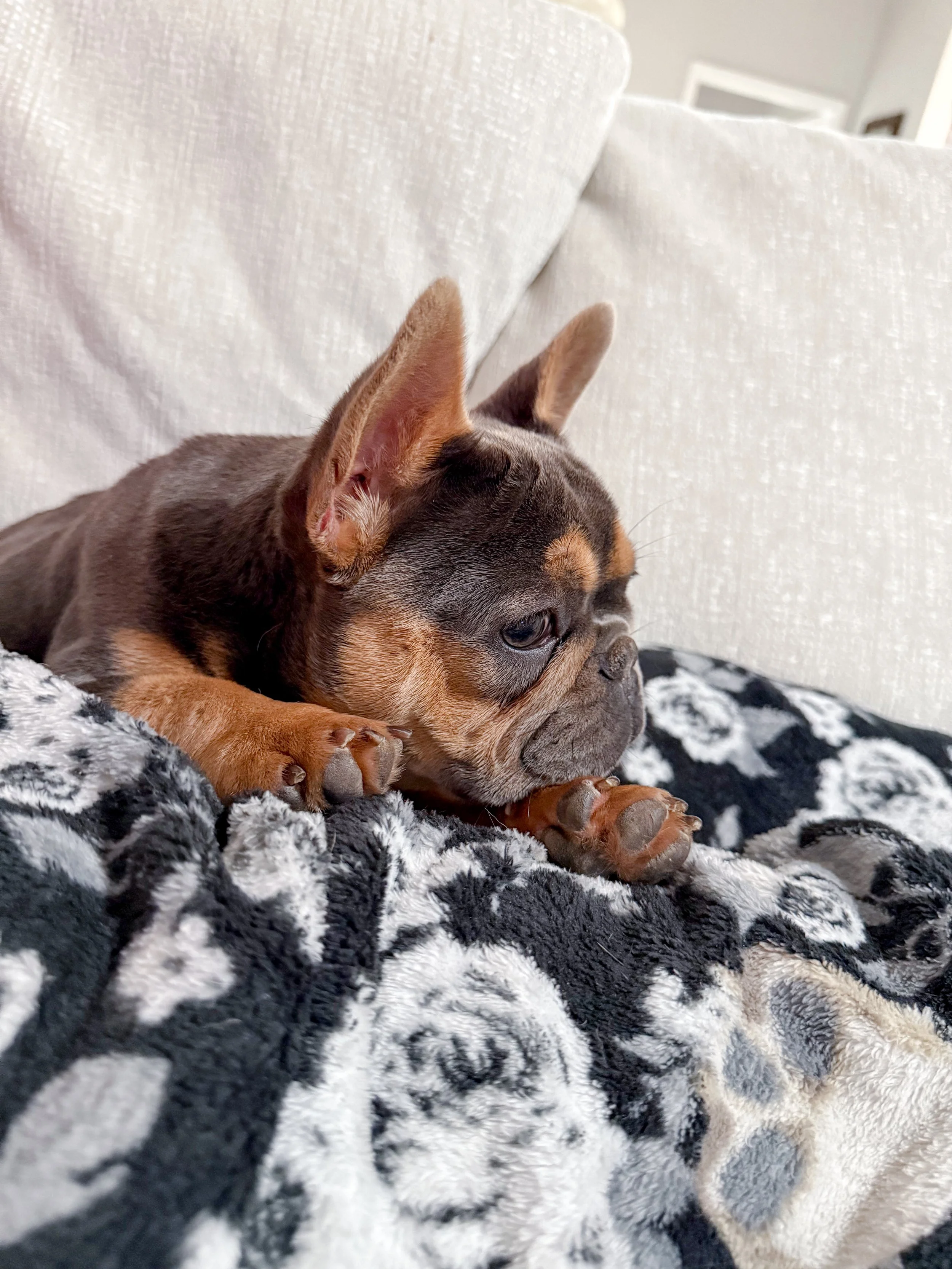 Persephone, lovingly called Percy, is blue tan covered in cream and carrying coco. She is the daughter of the one and only El Camino! Percy is co-owned with my partner Alyssa of Free to Fly Frenchies but lives right here with me in Louisiana. Percy loves to run the fence with the neighbors dogs, go on walks and snuggle up by the couch.